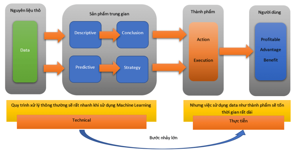 Như đề cập ở trên, dữ liệu ở thời điểm này có thể được xem như một loại hàng hoá và nó phải được xử lý để có thể cung cấp lợi ích cho người dùng hoặc lợi thế cho doanh nghiệp. Điều này tương tự như việc nguyên liệu thô được xử lý trước để trở thành hàng hóa thành phẩm mà người tiêu dùng có thể thưởng thức. Để biết thêm chi tiết, bạn có thể xem xét lược đồ sau: