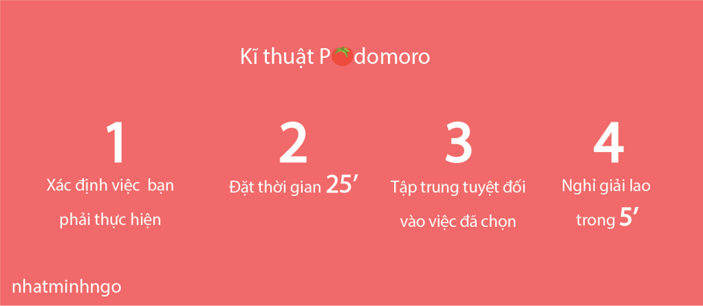 Một điểm lưu ý là bạn cần phải hoàn toàn tách mình khỏi các yếu tố làm gây xao nhãng: điện thoại – tin nhắn – email, v.v. Và trong 25’ này, đừng cố hoàn thành phần nội dung/công việc mà hãy cố gắng hình thành sự tập trung tuyệt đối. Khi có bất kì suy nghĩ nào chệch khỏi phần công việc/nội dung đang làm, hãy ghi chú lại để xử lý sau.
