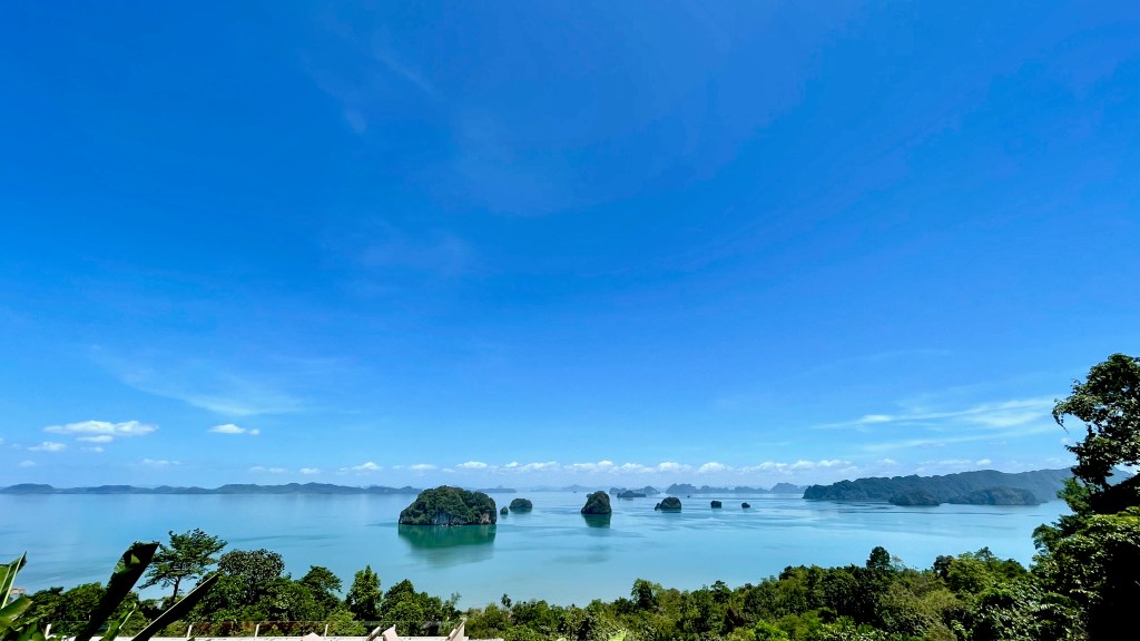 Một trong những lợi thế mà mình thấy ở Krabi là khung cảnh hoang sơ tự nhiên với núi đồi sừng sững, được biển bao quanh cùng rất nhiều hòn đảo với cát trắng, nắng vàng. Với lợi thế đó, việc có nhiều quán cafe, nhà hàng tận dụng để thu hút khách du lịch là một điều dễ hiểu. Trong mấy ngày ở đây, gia đình mình đã đến hai quán với góc nhìn khác nhau nhưng đều mang lại một cảm giác choáng ngợp về vẻ đẹp tự nhiên mà Krabi có được. Hai quán cafe này, một quán có góc nhìn ra biển cùng các hòn đảo vệ tinh của Krabi. Bạn có thể thấy nó khá giống vịnh Hạ Long nhưng cảm giác thật là nước ở đây trong hơn nhiều, kết hợp với thời tiết có mây hôm bữa khiến mình có cảm giác như chốn bồng lai tiên cảnh khi ngồi từ quán cafe nhìn ra.