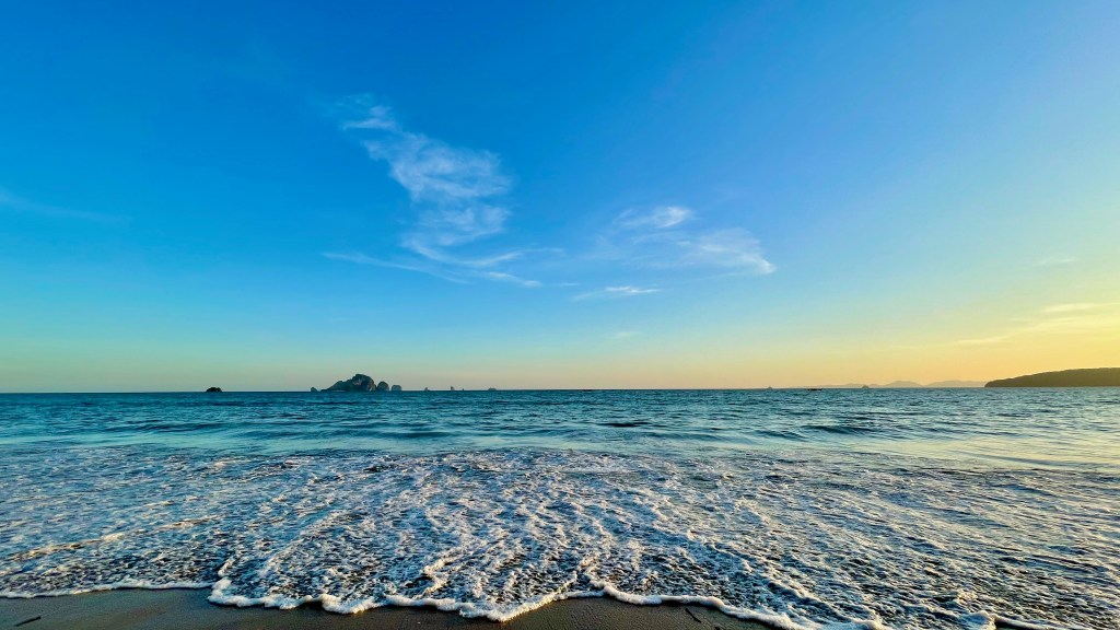 Buổi chiều ngày thứ 2 của chuyến đi, gia đình mình chạy xe ra biển Aonang gần đó để ngắm mặt trời lặn. Hoàng hôn ở Aonang thật sự rất đẹp, vào thời điểm tham quan, mặt trời sẽ lặn hẳn vào lúc 6h30, thì tầm gần 6h ra bãi biển, bạn sẽ thấy rất nhiều người cũng đang dạo con đường cát để ngắm hoàng hôn. Đây cũng là thời điểm tuyệt vời nhất để bạn có thể ngắm nhìn mặt trời lặn hẳn. Ánh nắng mặt trời, kết hợp với bển xanh và những hòn đảo nổi trên mặt biển khiến cảnh sách đẹp như một bức tranh vẽ, mà thật tình là không có máy ảnh nào bắt được. Thứ khiến nó đọng lại là cảm xúc của bạn trước vẻ đẹp quá lộng lẫy của tự nhiên. Thật ra, gia đình mình đã đi cũng được vài bãi biển, ngắm được hoàng hôn lặn ở vài chỗ nhưng với cá nhân mình thì hoàng hôn ở Krabi là một trong những hoàng hôn đẹp nhất mà mình có dịp ngắm nhìn.