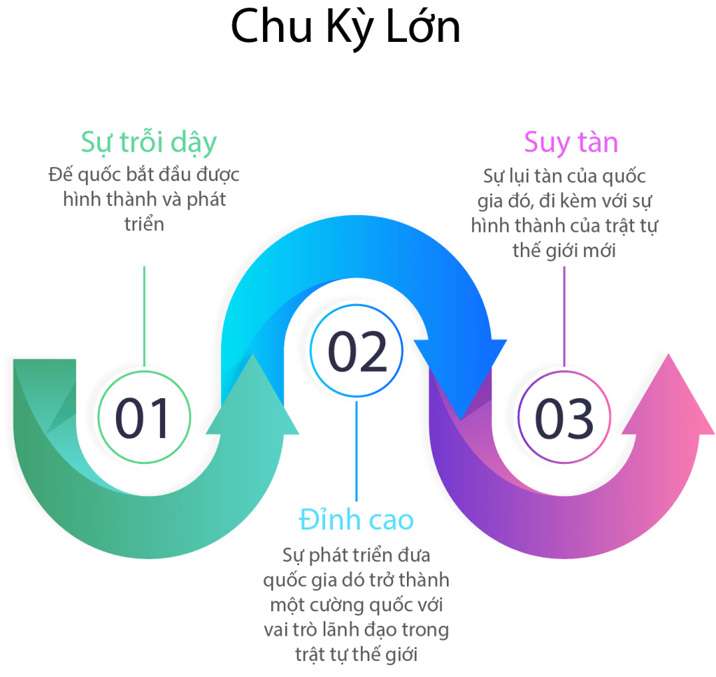 Quá trình hình thành, phát triển và suy thoái của một quốc gia được gọi là Big Cycle. Chu kì này cũng giống như việc con người được sinh ra, trưởng thành, già đi và cuối cùng là cái chết. Chu kì mà tác giả nói tới cũng tương tự thế và đó là còn đường mà các đế quốc đều sẽ phải đi qua: Sự trỗi dậy bắt đầu với việc tái cơ cấu phân bổ nguồn lực hợp lý, đẫn đến Thời kì hoàng kim đỉnh cao phát triển mạnh mẽ, rồi gieo những hạt mầm dẫn đến sự Suy tàn.