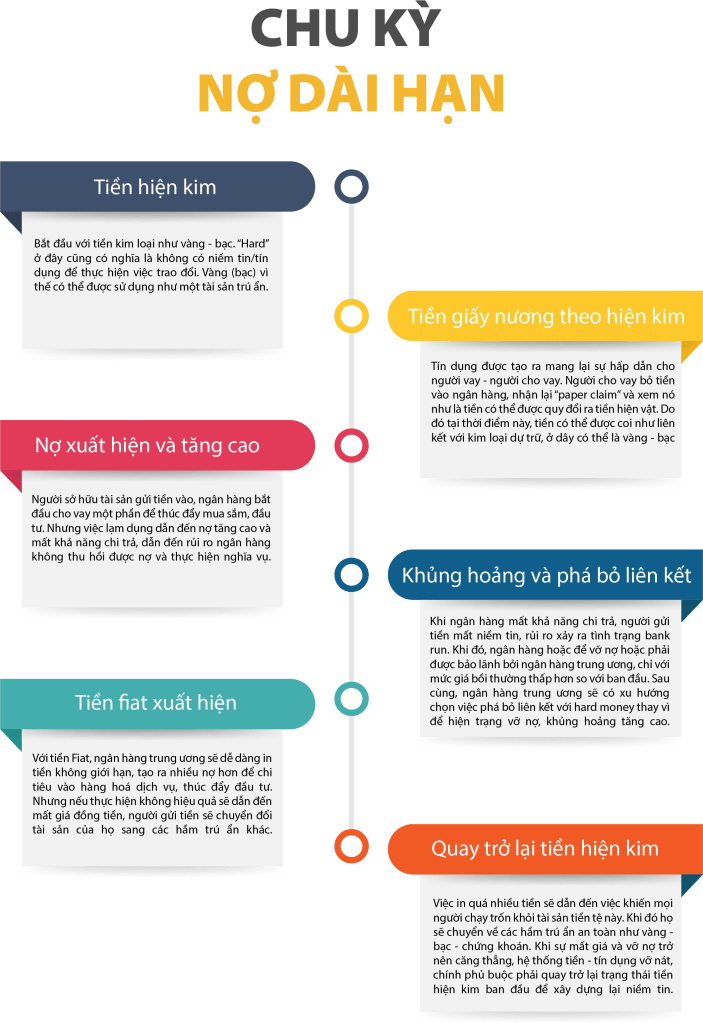 Chu kì nợ dài hạn có thể được tóm gọn như là một quá trình chuyển đổi từ tiền Loại 1 với rất ít nợ hoặc không có nợ sang Loại 2 khi ngân hàng neo tiền theo một kim loại, tài sản nào đó để cho vay và thúc đẩy sự phát triển kinh tế xã hội và cuối cùng là Loại 3 với nợ trở nên quá lớn đẫn tới việc quay lại tiền Loại 1. Những chu kỳ nợ dài hạn này được thúc đẩy bởi vai trò của ngân hàng trung ương và khả năng kích thích nền kinh tế của họ. Về cơ bản, ngân hàng trung ương có vai trò rất quan trọng trong quá trình vận hành nền kinh tế, với các chính sách về tiền tệ. Họ vai trò kiểm soát cung tiền, tín dụng để qua đó không gây tác động lớn đến nền kinh tế.